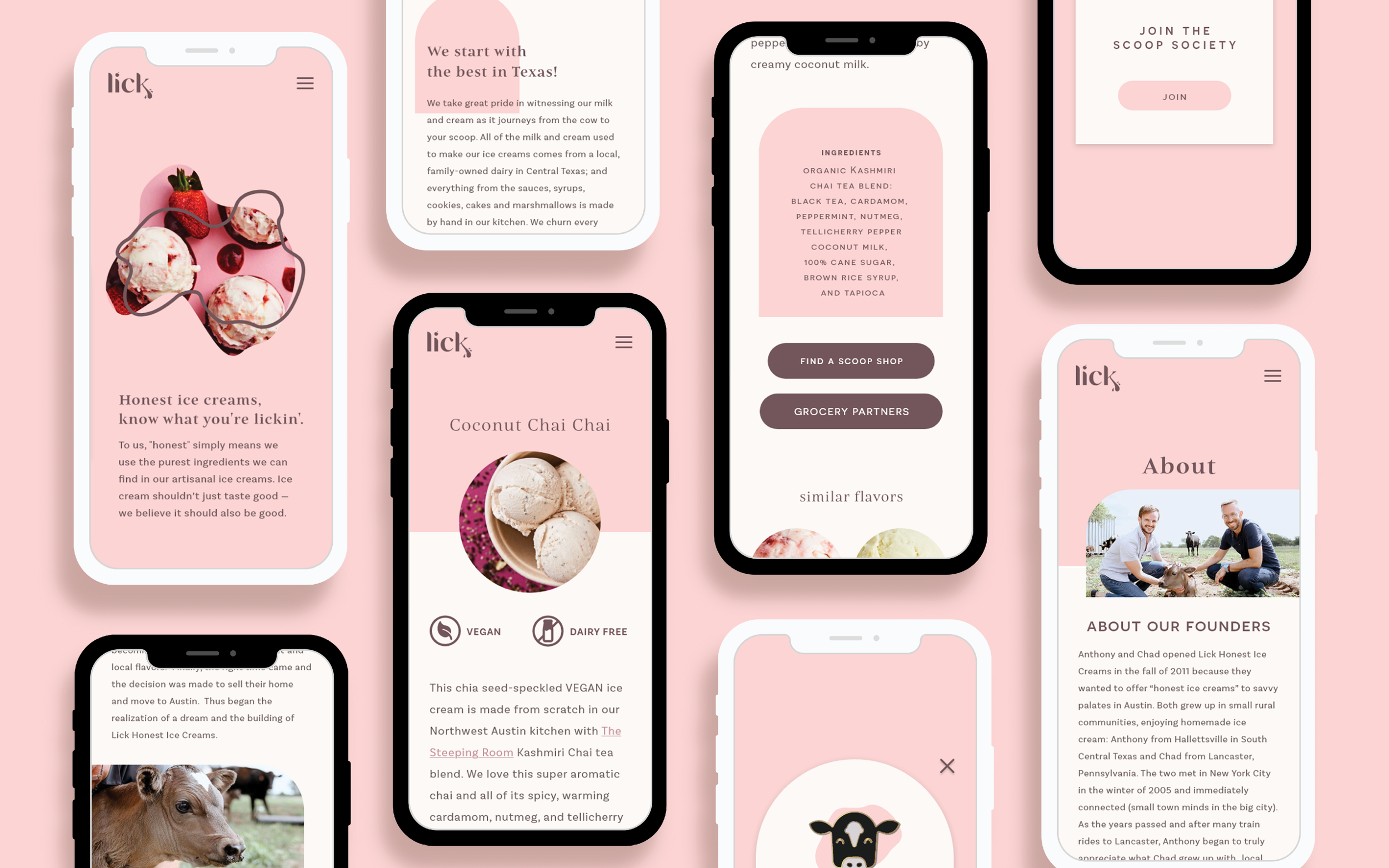 Lick Honest Ice Creams is a Texas-based artisanal ice cream company. They pride themselves on making ice cream that both tastes good and is made of good ingredients. This re-envisioned Lick creates an elevated experience from start to finish. This experience includes packaging, environmental, uniforms, website, and scoop society package.